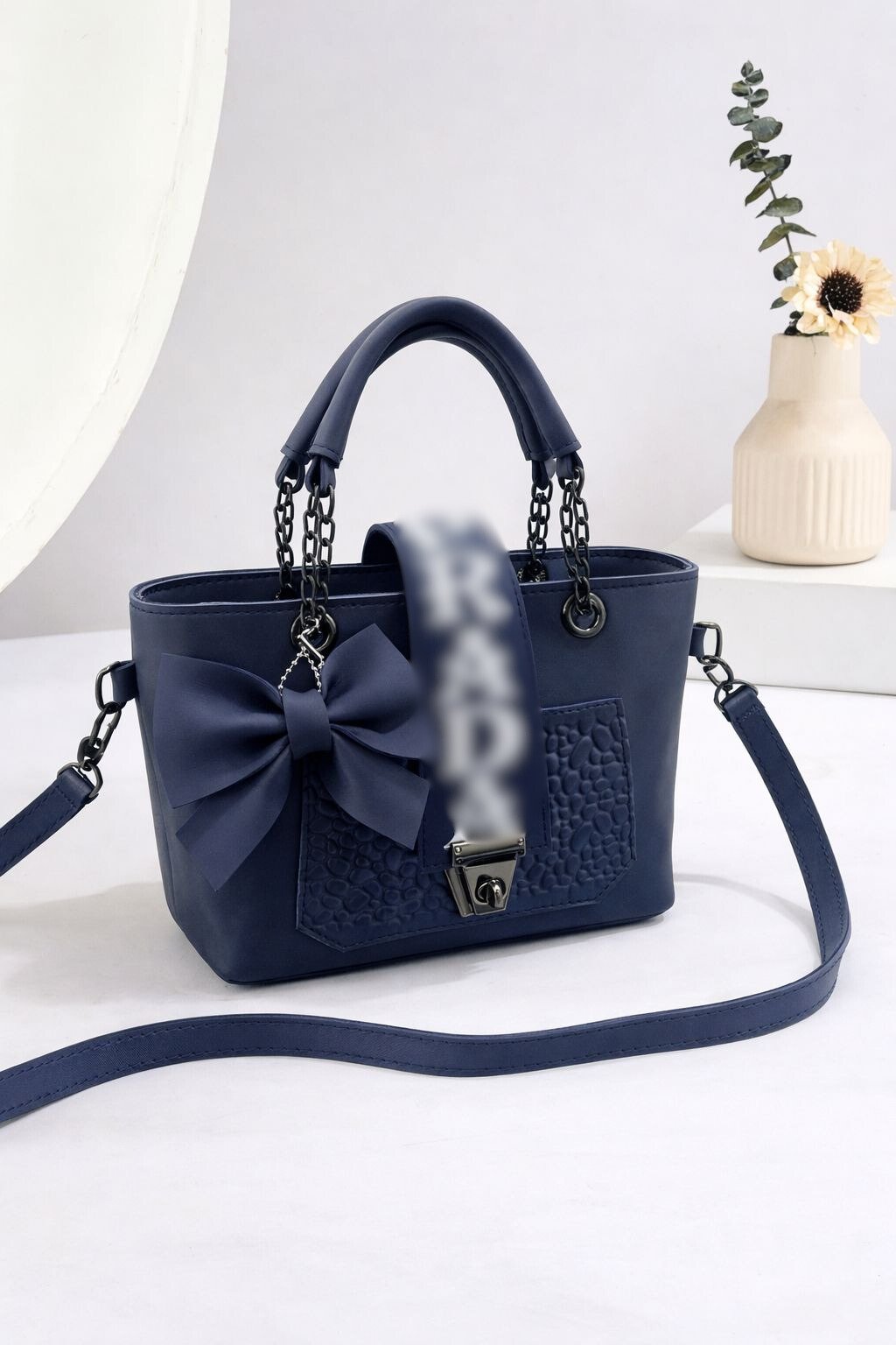 Be the first to review “Bow Accent Embroidered Handbag With Chain Strap” Cancel reply